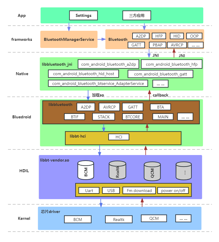 libbluetooth:主要是bluedroid的蓝牙协议栈的具体实现,向下调用libbt-hci的接口加载**libbt-vendor;**向上供libblueooth_jni的回调;