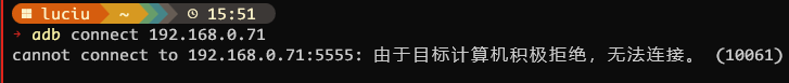 这个错误 由于目标计算机积极拒绝,无法连接。(10061) 是 Windows 报的 socket 连接失败,说明Win10 设备能访问目标 IP,但是对方没有在监听 adb(5555)端口。